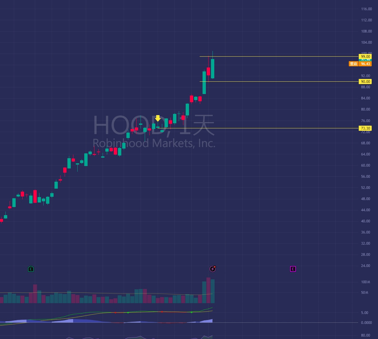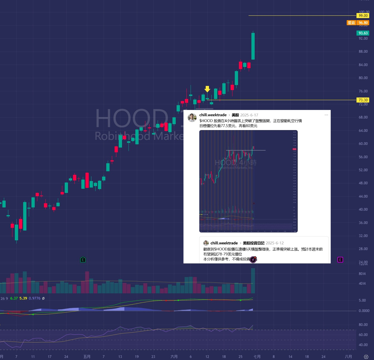 $HOOD 本週劍指99美元,現在連我爺爺家的貓都認識這家公司了,這辨識度竄升速度簡直荒謬
