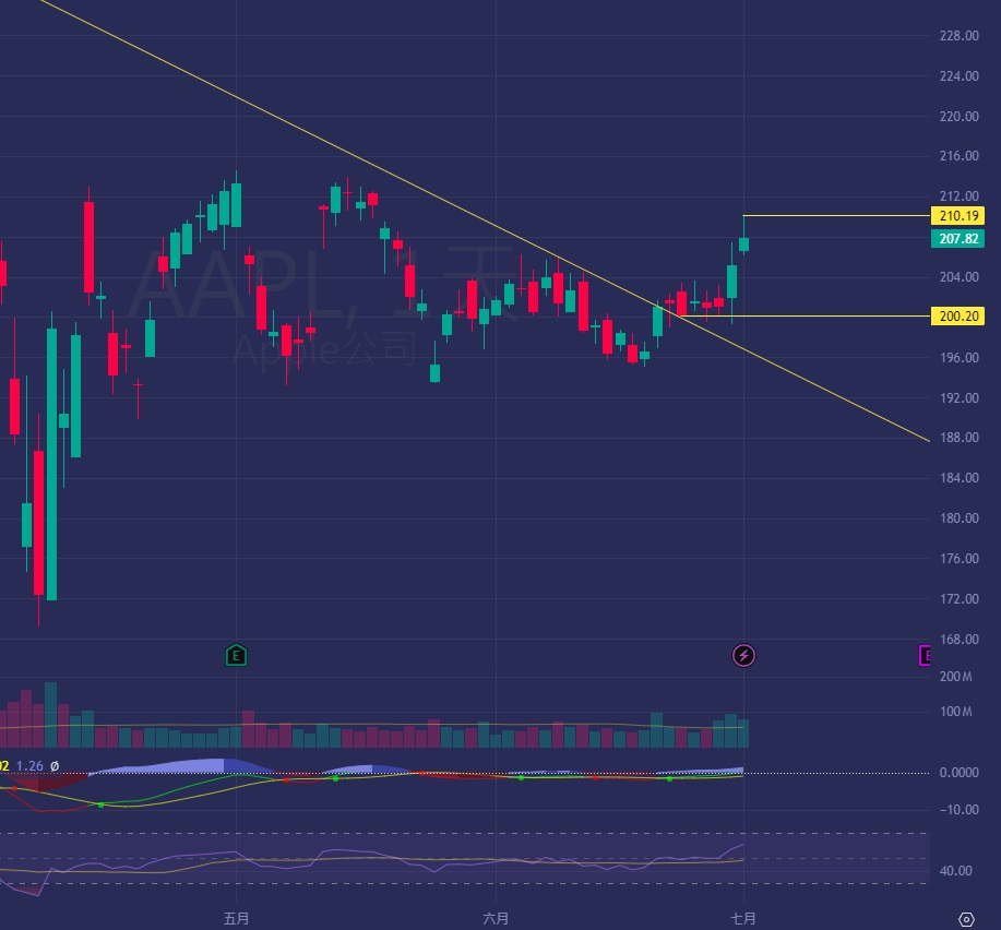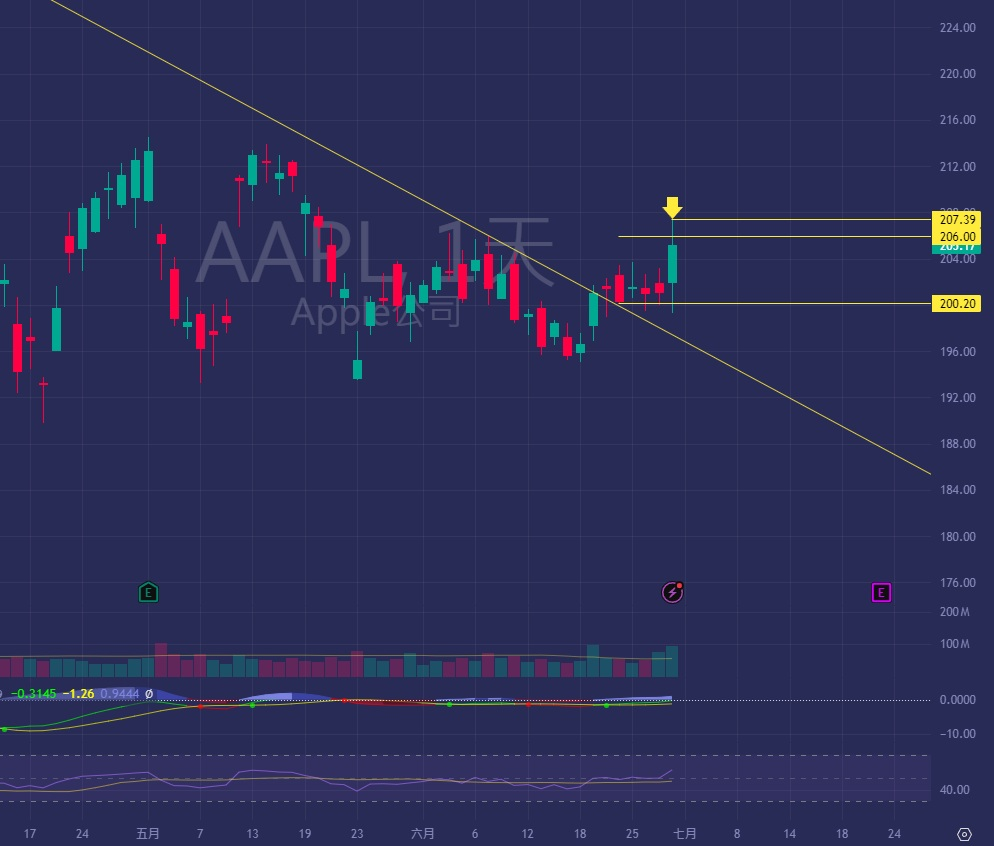 昨天,股價完成對206美元的超越,7/11到期的205看漲期權已笑納50%+收益,連7/18到期的同款也賺了25%+,看來市場對這顆蘋果很有信心