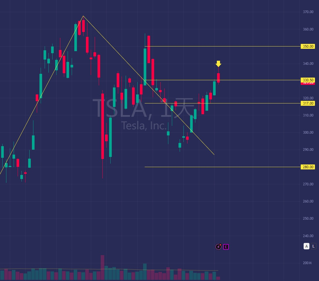 TSLA今日從330.5美元高點回落,我預測本週底部約在310-318美元,之後進入盤整,當前持305p現金擔保看跌期權和350c備兌看漲期權的短跨組合。若股價維持在行權區間,預計獲利1570+美元