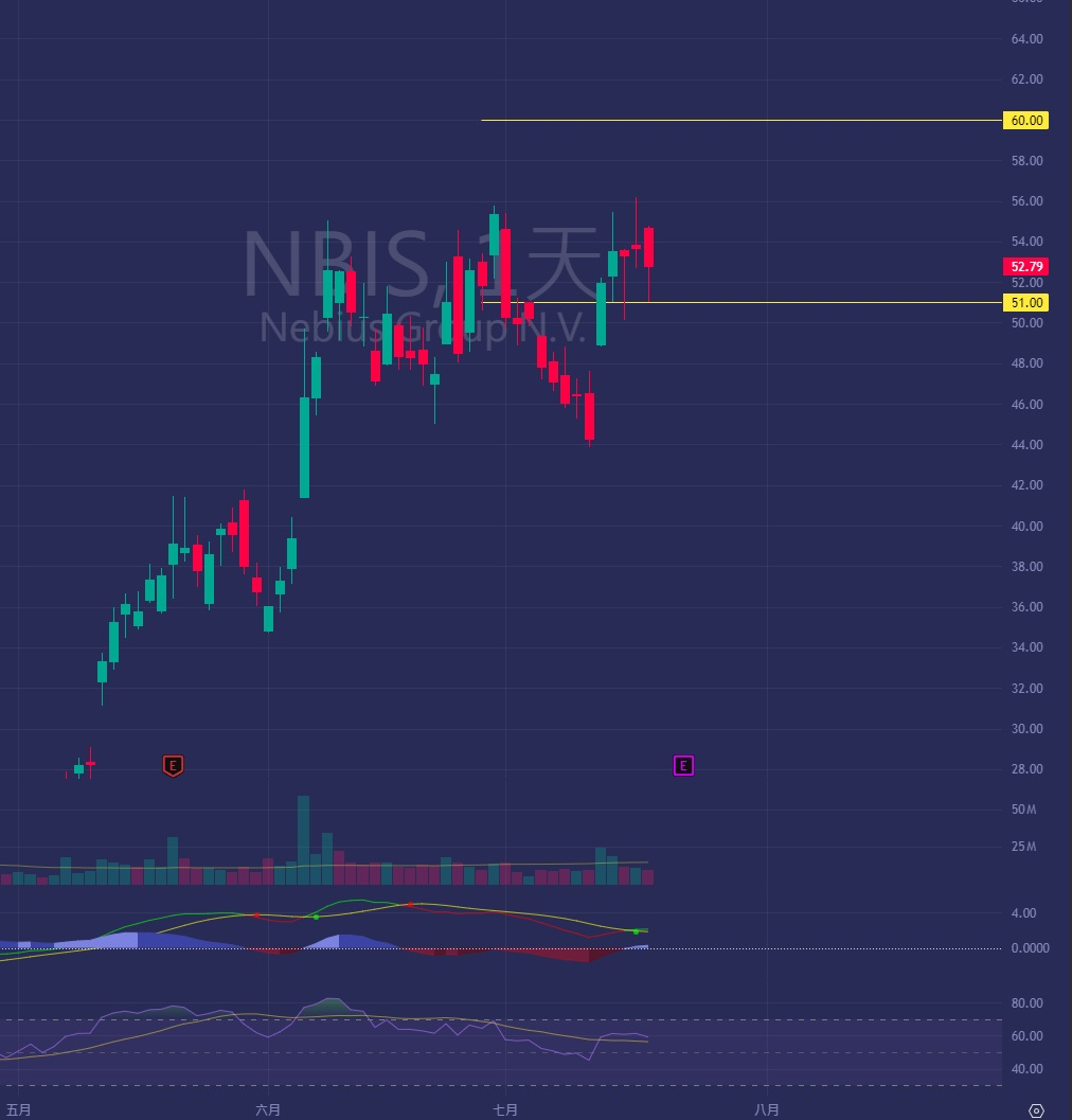 NBIS在51價位獲得強力支撐,看來即將突破前高,目標60,我增持了8/15的55看漲期權,同時賣出下週五49的現金擔保看跌期權,低點進場後已賺30%,這個夏天可能再漲8-15%