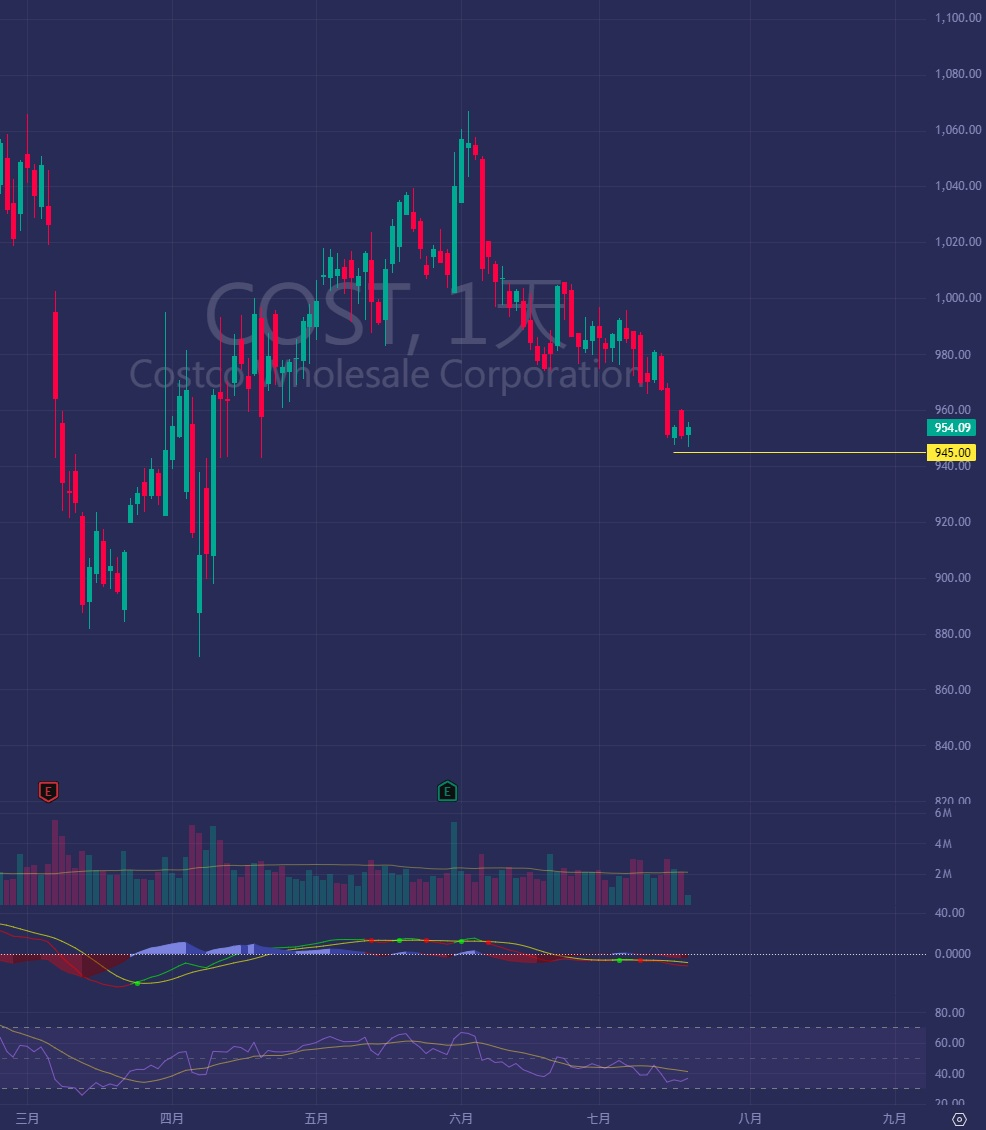 我觀察到 $COST Costco 自6月高點回落12%,現於945位置築底完成,出現反轉信號,短期有望上漲3-5%