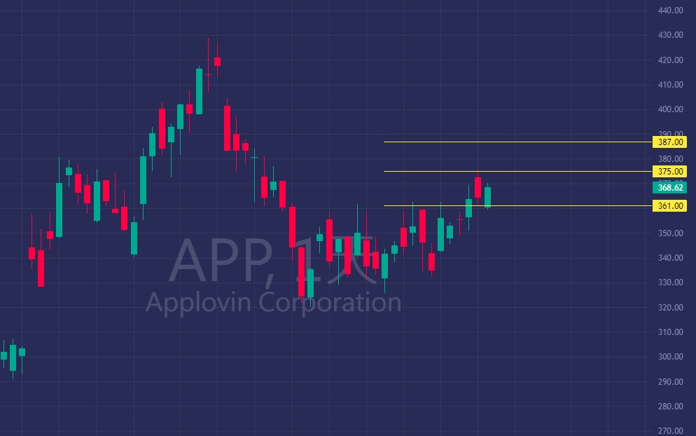 APP目前從361點位反彈,目標先看375,接下來兩週可能挑戰387-390區間,8/15到期的400C也在觀察名單中